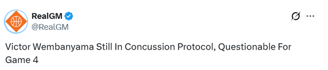这位年度最佳防守球员,在G2第二节比赛中头部撞击地面后,便一直缺阵至今。马刺主帅米奇-约翰逊今日确认,球队两届全明星球星文班亚马仍在执行NBA脑震荡保护协议,因此马刺对阵开拓者首轮G4的出战状态暂未确定。